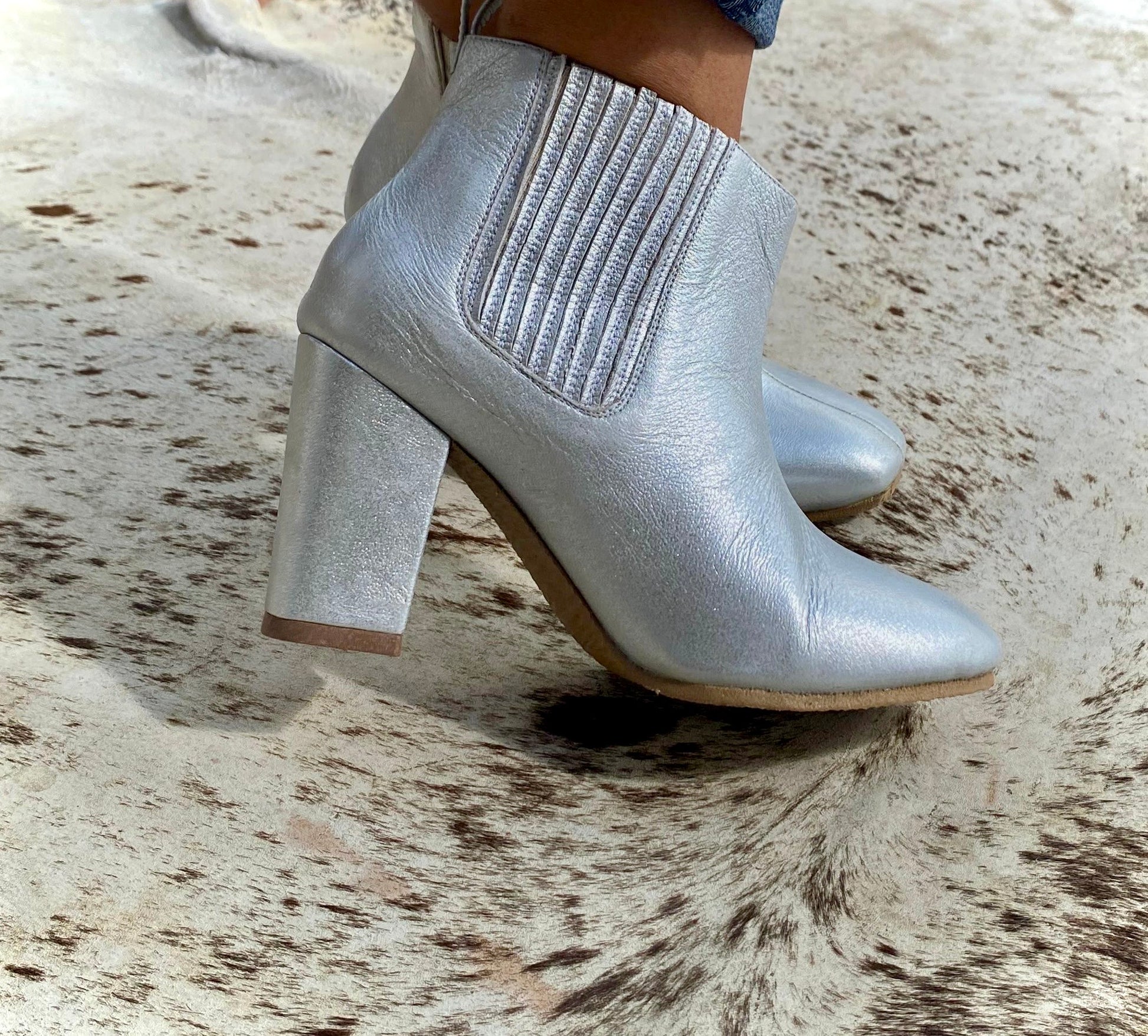 Nuestra vida no está hecha para ser aburrida! Botas de piel plateada, o negras de charol, con diseño sofisticado, tacón medio grueso y caña baja, perfectas para destacar con elegancia y sofisticación, combinando comodidad para cualquier ocasión.