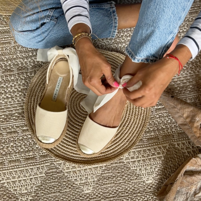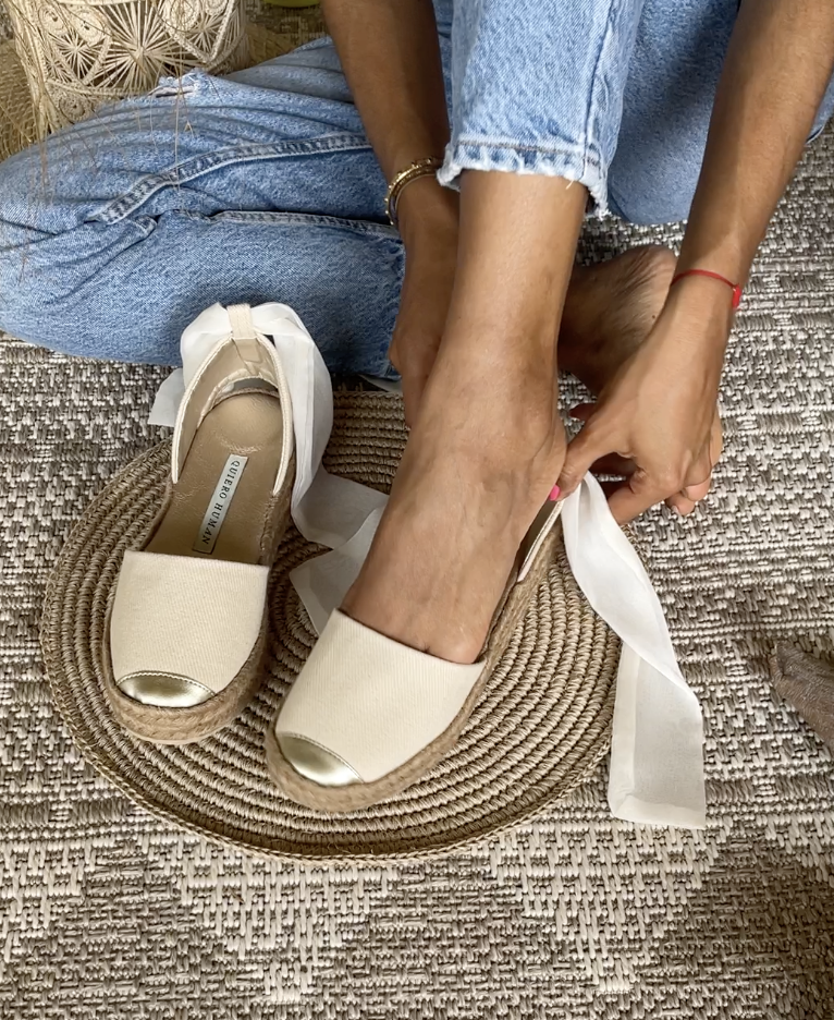 Espadrillas color neutral con toque sofisticado en punta color champaña para acompañarte siempre bien vestida. La pañoleta es ideal para resaltar ese espíritu libre que llevas dentro de una manera romántica y cool.