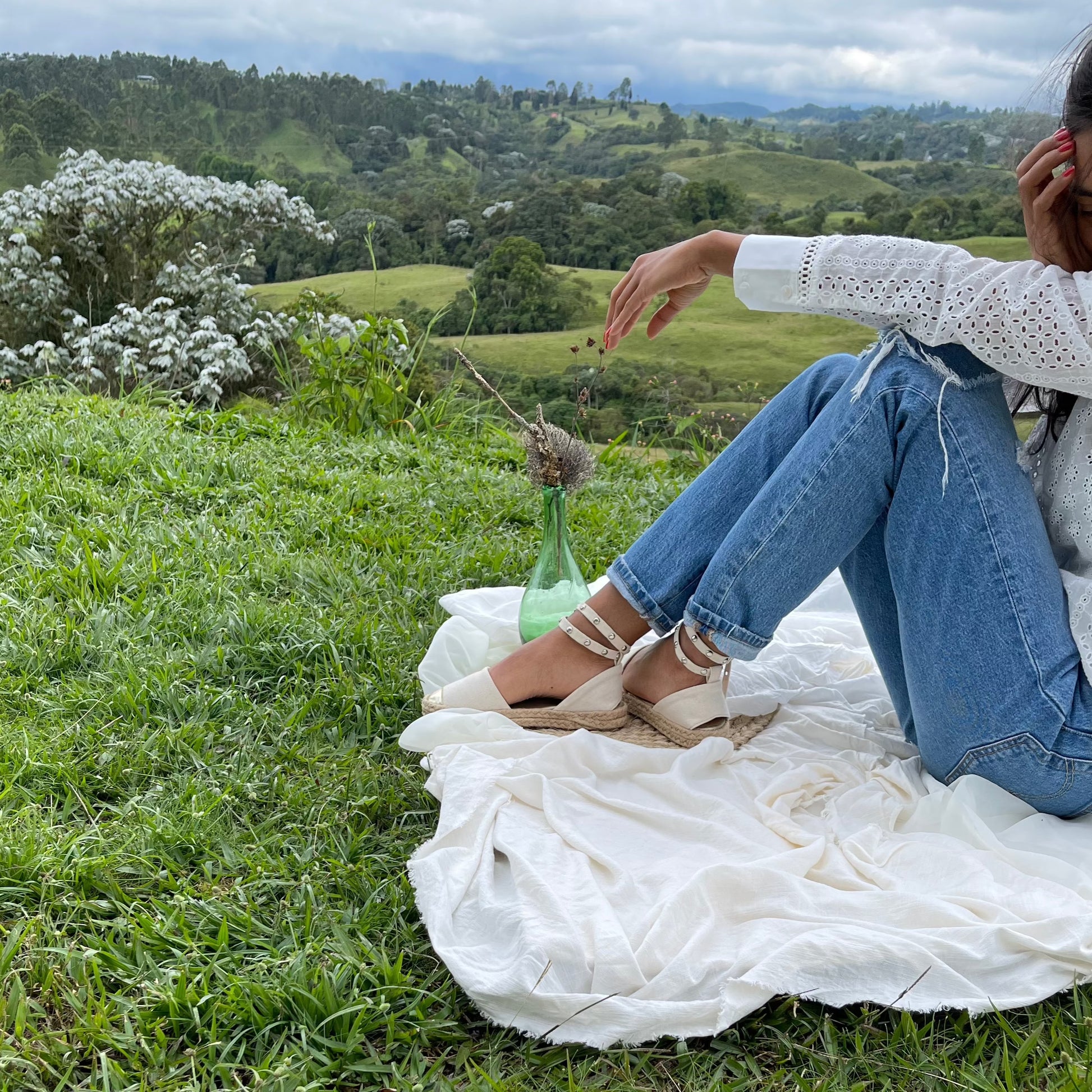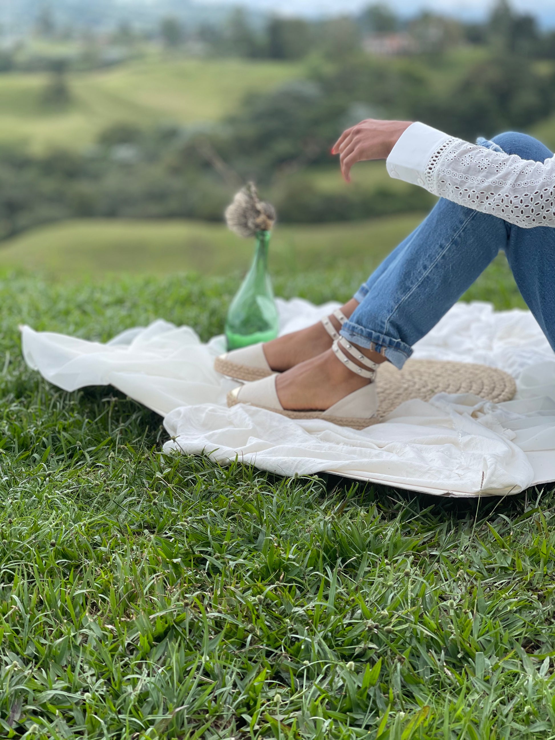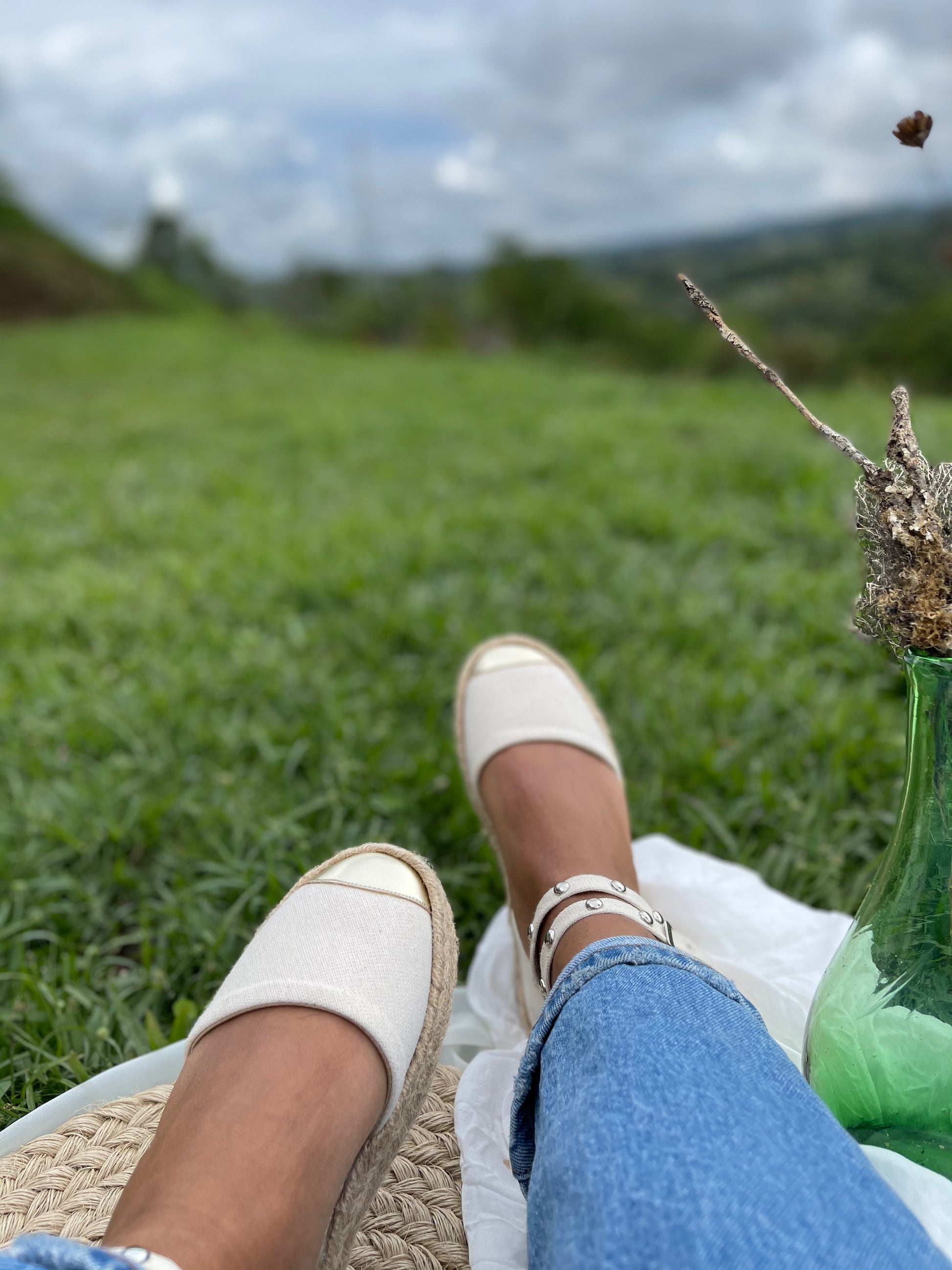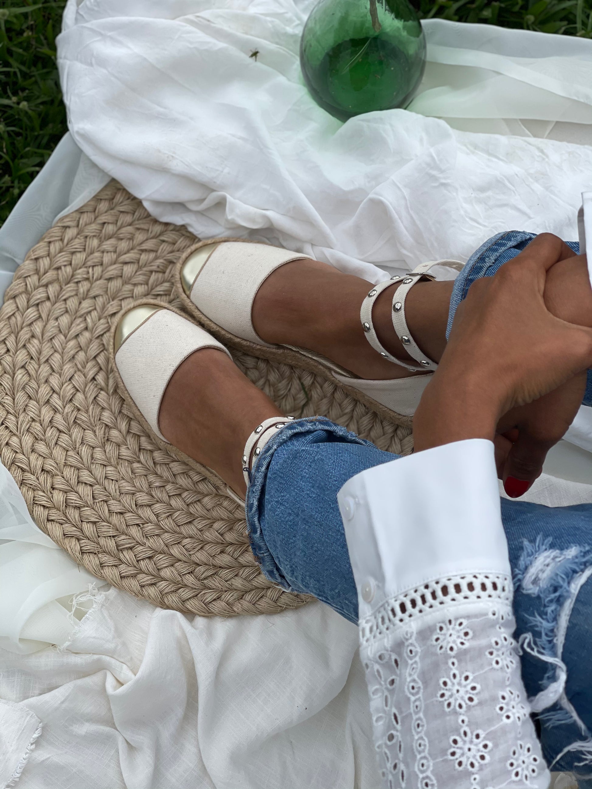 Nuestras espadrillas Por Mi con doble correa de taches resaltan tu feminidad y tu confianza en tu día a día. Espadrillas color neutral con toque sofisticado en punta color champaña para acompañarte siempre bien vestida.